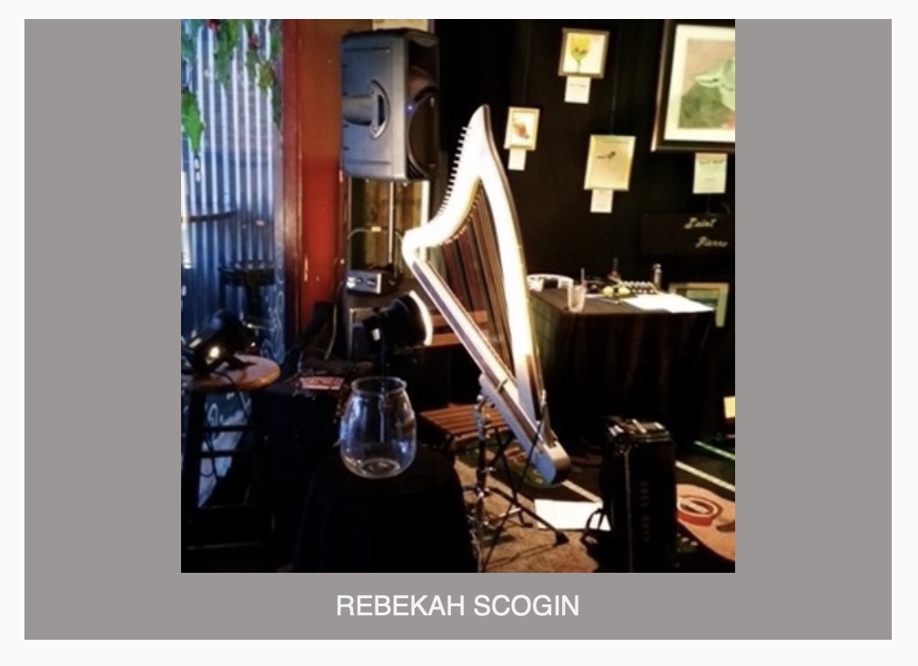 Rebekah Scogin is a classically trained harpist whose love of music know no bounds. Whether it’s a beautiful piece by Vivaldi or Ravel or a Broadway show tune incorporating elements of jazz her music appeals to all age listeners.